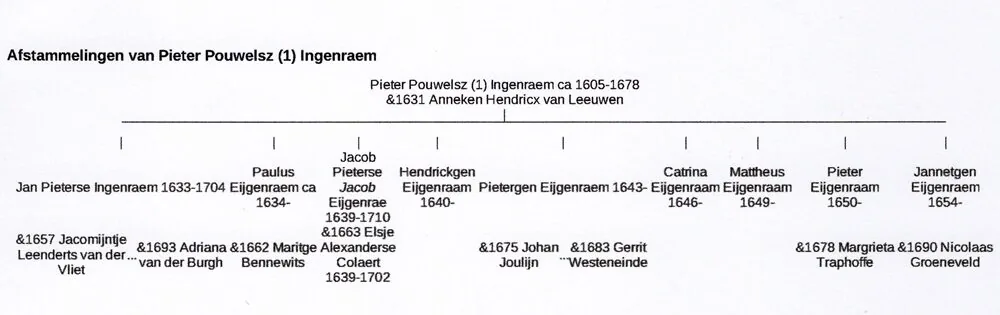 Pieter Pouwelsz Ingenraem, trouwde in 1631 te Den Haag met Anneken Hendricxs van Leeuwen, hij is samen met zijn zuster Maria Pouwels en zijn broer Pieter Pouwelsz ( het waren twee broers met dezelfde naam!) vanuit Arcen (Limburg) naar Den Haag gekomen.