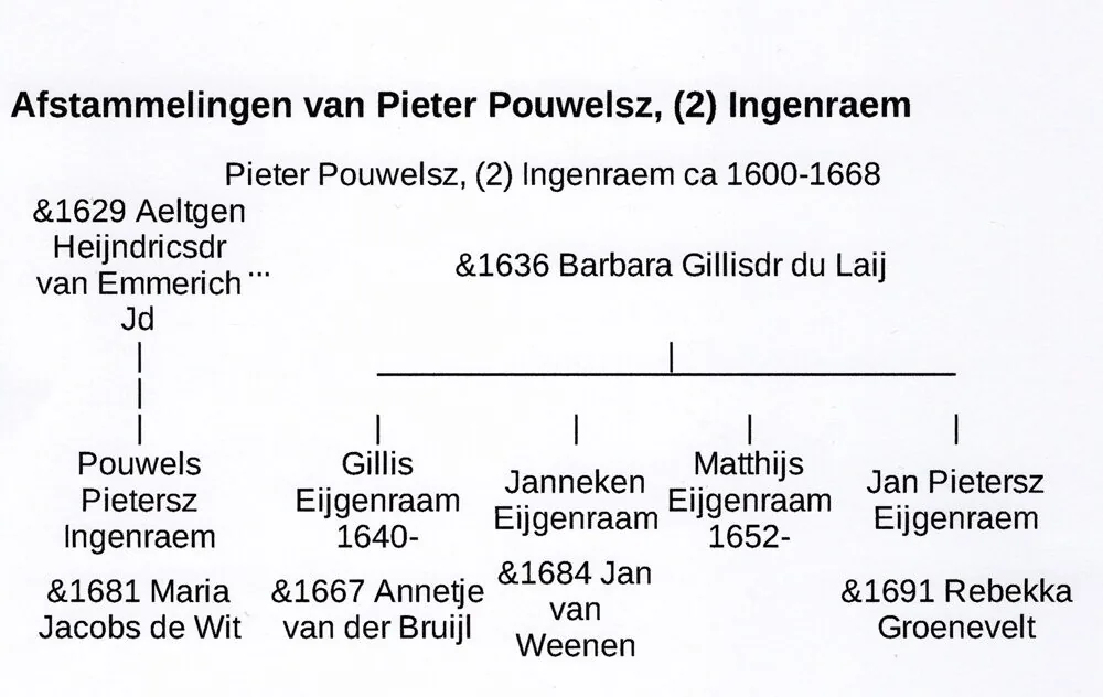 Pieter Pouwelsz Ingenraem, trouwde in 1631 te Den Haag met Anneken Hendricxs van Leeuwen, hij is samen met zijn zuster Maria Pouwels en zijn broer Pieter Pouwelsz ( het waren twee broers met dezelfde naam!) vanuit Arcen (Limburg) naar Den Haag gekomen.